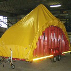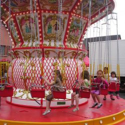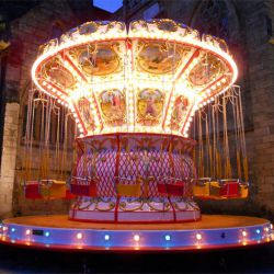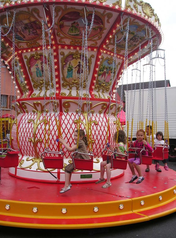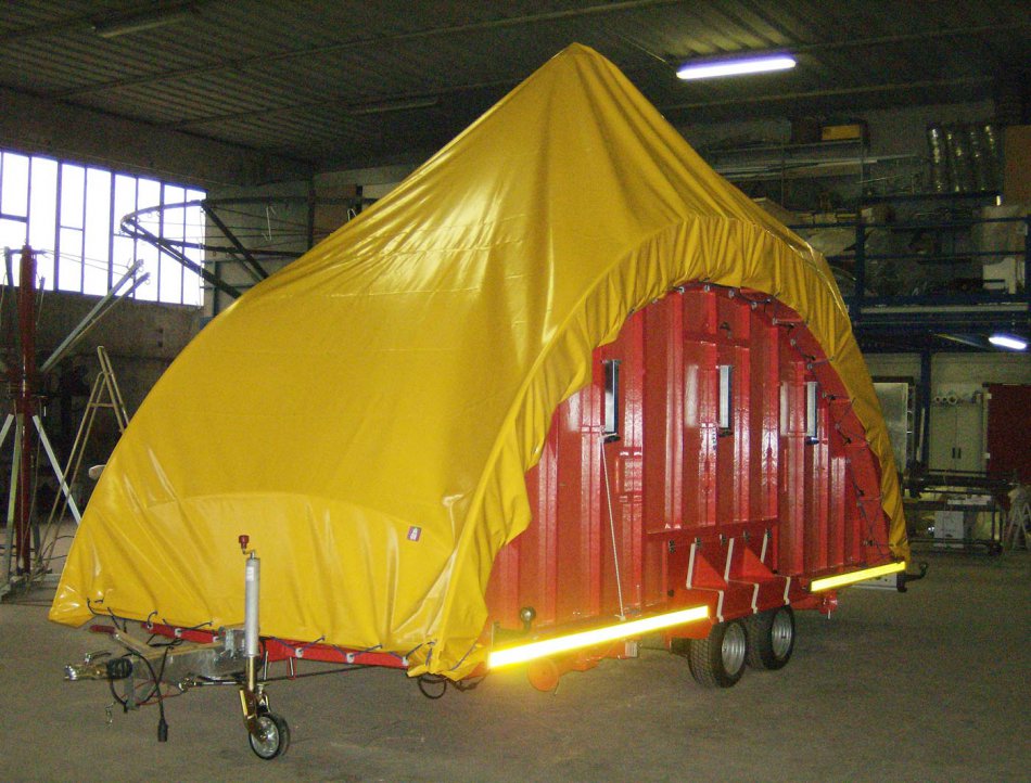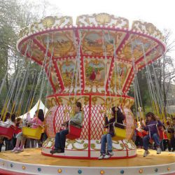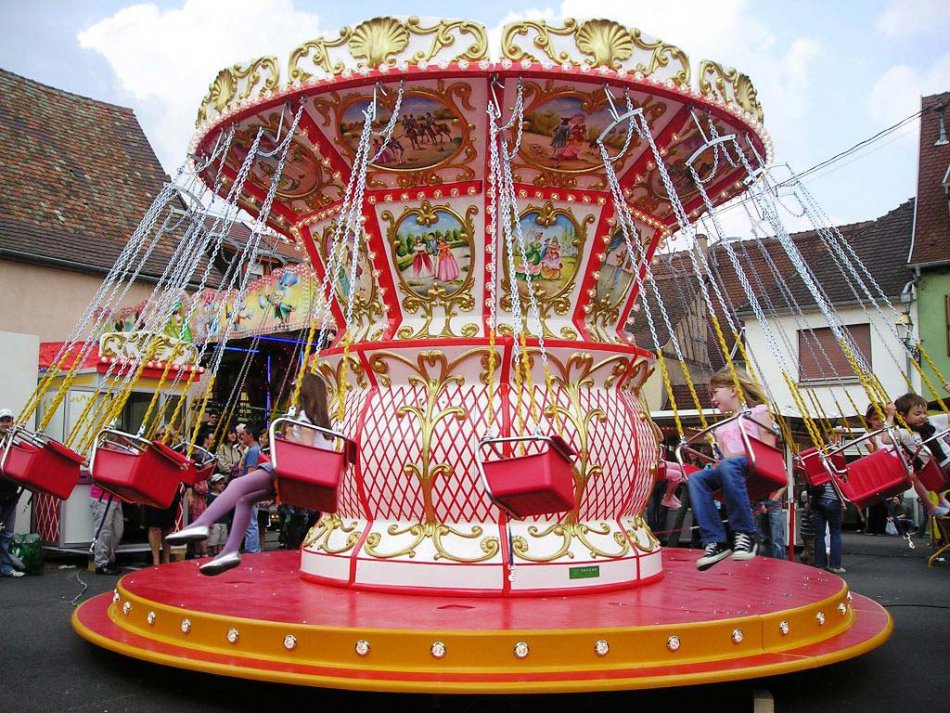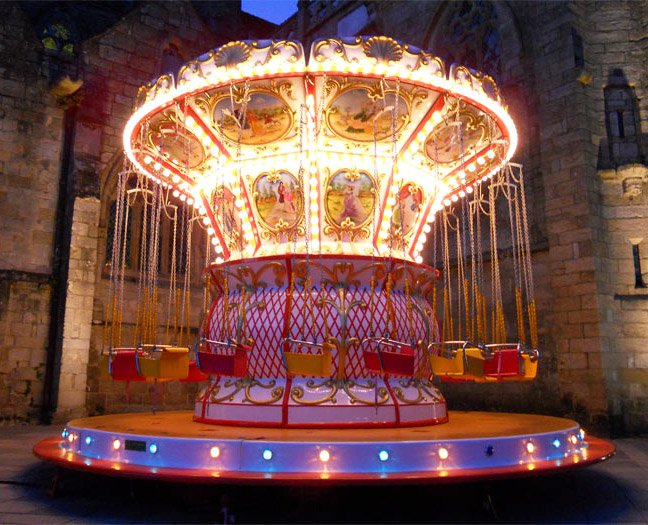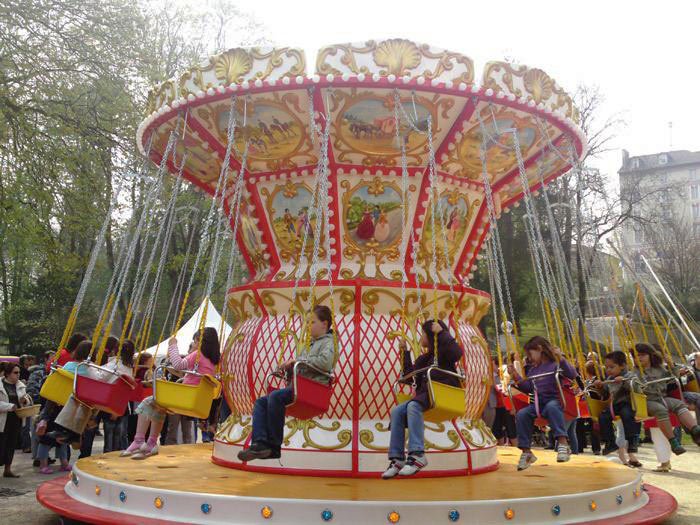 Giostra a catenelle su rimorchio con pedana in vetroresina Ø m. 6,50 rinforzata con struttura in ferro e legno marino - Pannelli in vetroresina e rilievi dorati in stile barocco lavorati in gelcoat integrato nello stampo