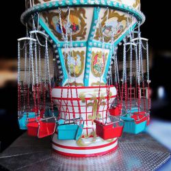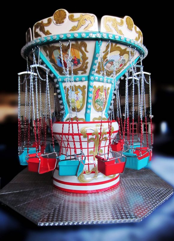 Giostra a catenelle per parco fisso con pedana ottagonale in alluminio - Pannelli in vetroresina dipinti ad aerografo stile barocco