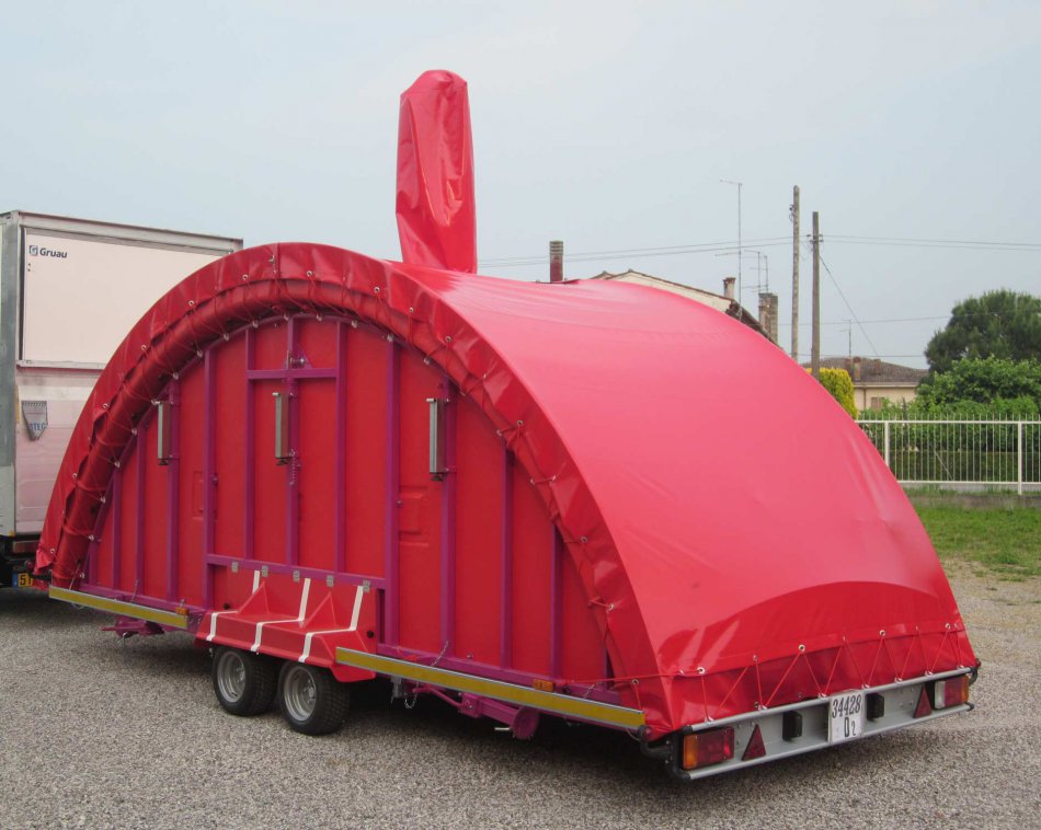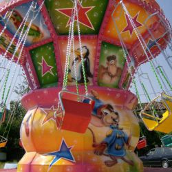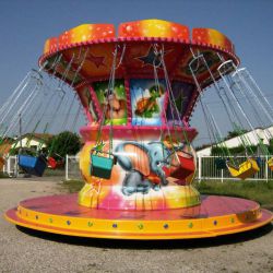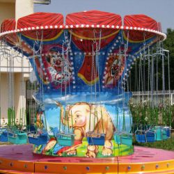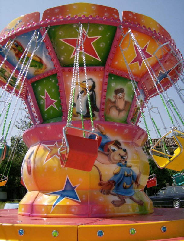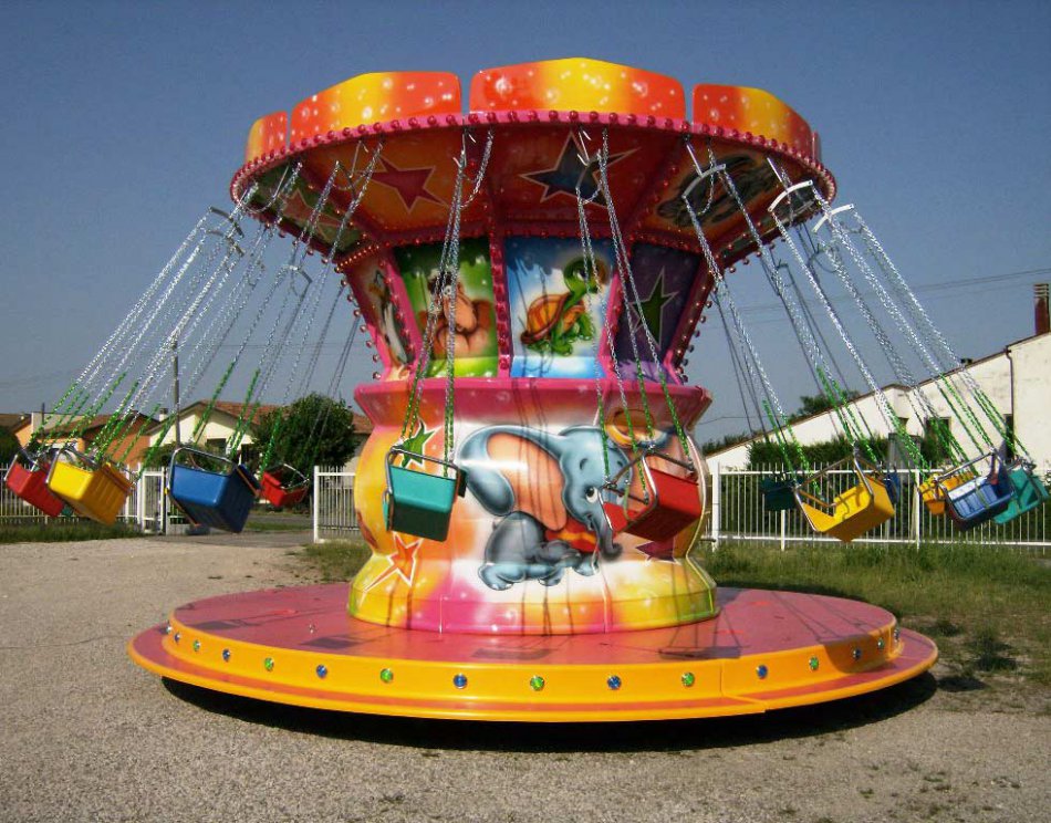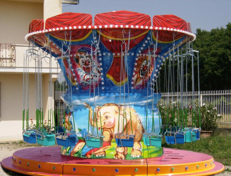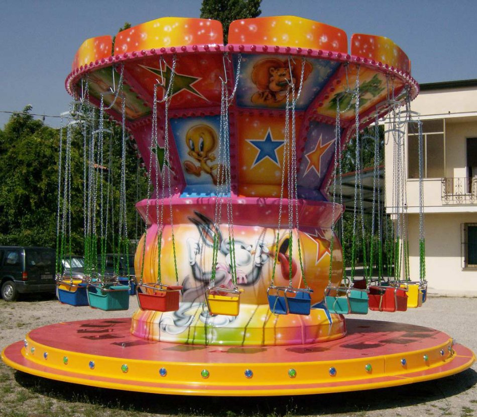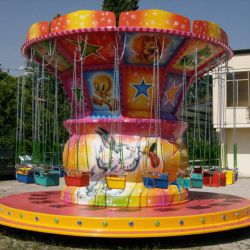 Giostra a catenelle su rimorchio con pedana in vetroresina Ø m. 6,50 rinforzata con struttura in ferro e legno marino