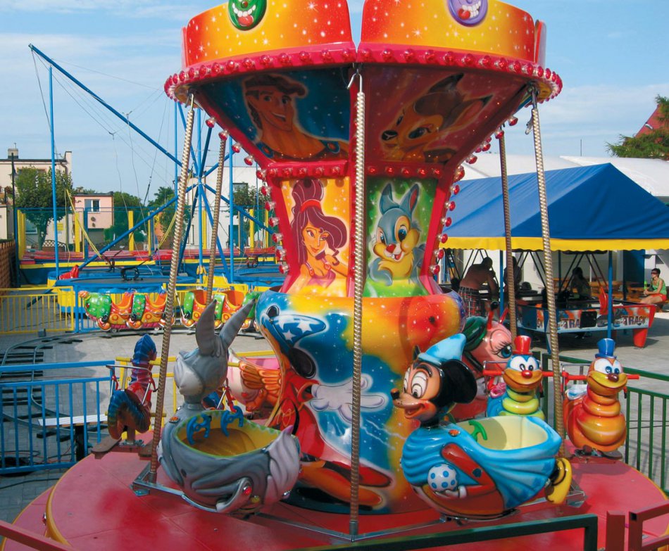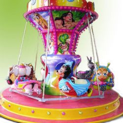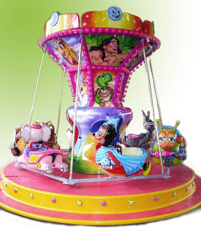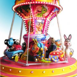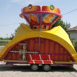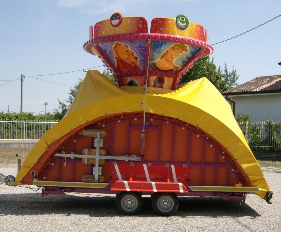 Carosello per bambini con soggetti vari su rimorchio - Pedana in vetroresina Ø m. 4,50 rinforzata con struttura in ferro e legno marino